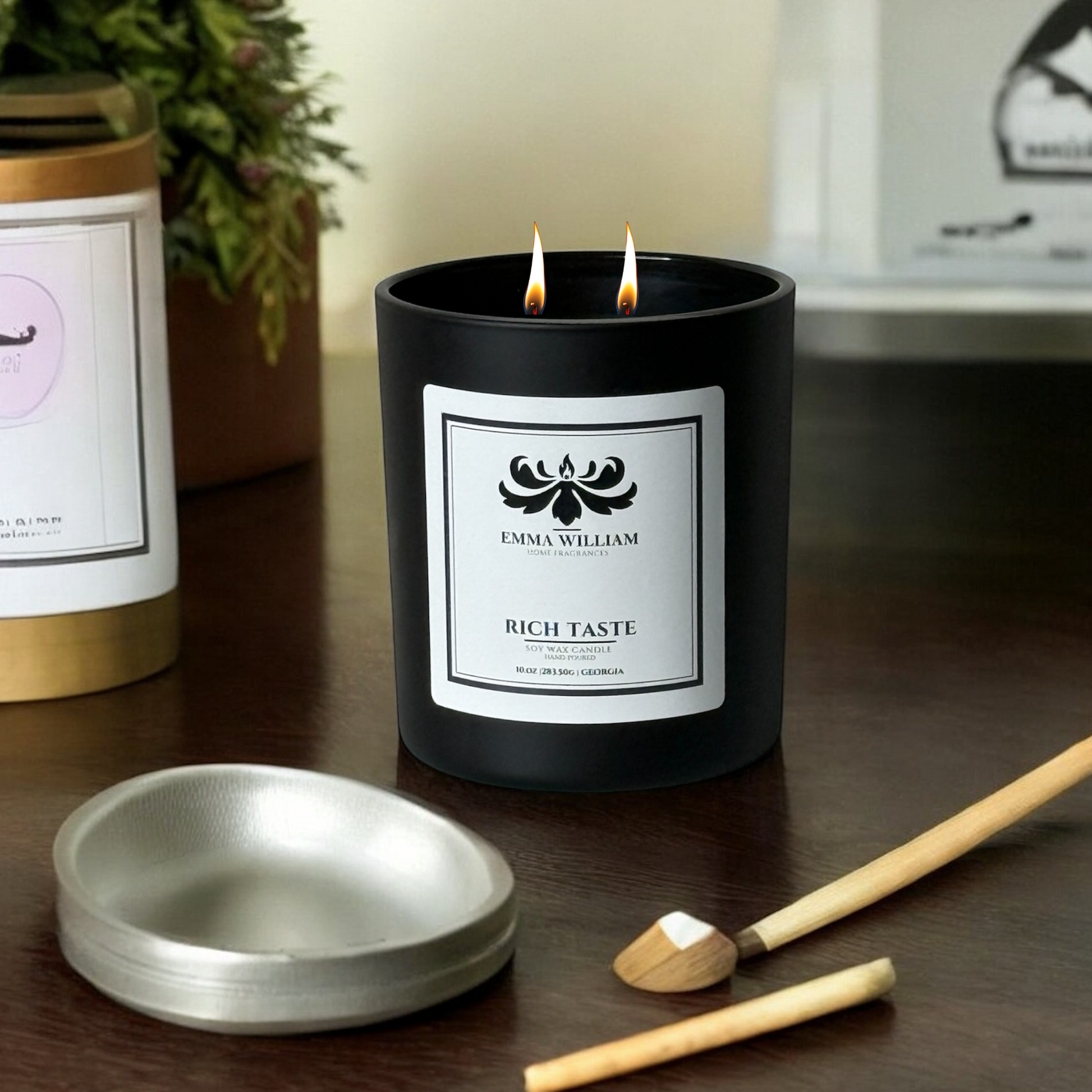 Vessel: A black matte vessel paired with double wicks creates an elevated, inviting atmosphere that beautifully enriches any space.